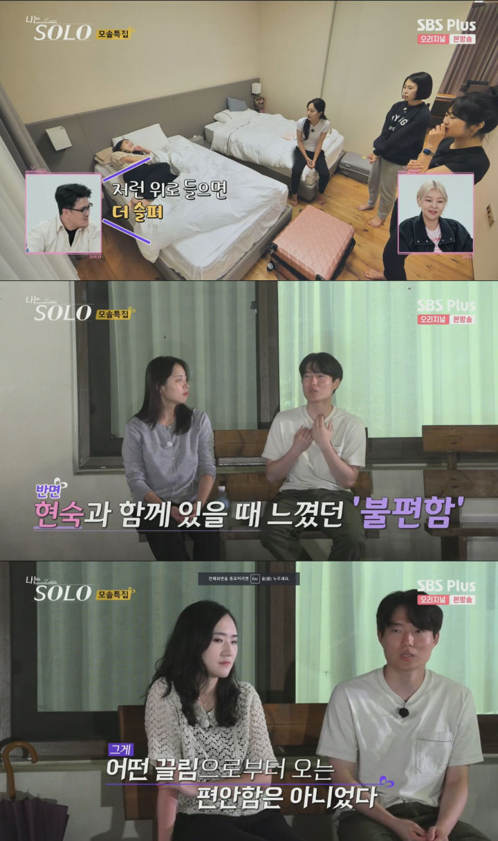 그 와중에 순자는 놓칠까 봐 걱정된다는 생각에 다음 주의 행동은 좀 더 직접적으로 마음표현을 하겠다고 얘기하고 있습니다. 영철은 현숙과의 데이트와 대화 중에 같은 예체능계열은 불안전하다며 만나는 것을 좋아하지 않는다고 얘길 했고, 현숙 또한 친구로 지내길 희망한다고 얘길 했습니다. 그러고 나서 밤에 제작진에게 옥순과 얘기하고 싶다고 얘길 합니다.